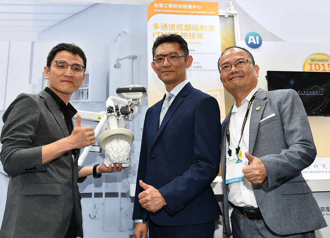 圖:金屬中心「多通道經顱磁刺激rTMS系統技術」,用於治療憂鬱症,可同步刺激多個腦部區域,操作簡便、縮短70%治療時間,助台朔重工跨足醫療新領域。左起為金屬中心工程師胡博期、經濟部產業技術司司長郭肇中、金屬中心執行長賴永祥。