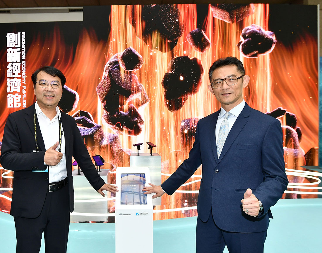圖:工研院「大阪世博(生命劇場)-虛實互動展演技術」,把在日本大阪世博展演的技術搬回臺灣首度亮相,運用與智慧工廠同等級的軟硬整合技術,打造5.5米高科技瀑布,為全場最吸睛的焦點。左起為工研院電子與光電系統研究所組長劉建志、經濟部產業技術司司長郭肇中。